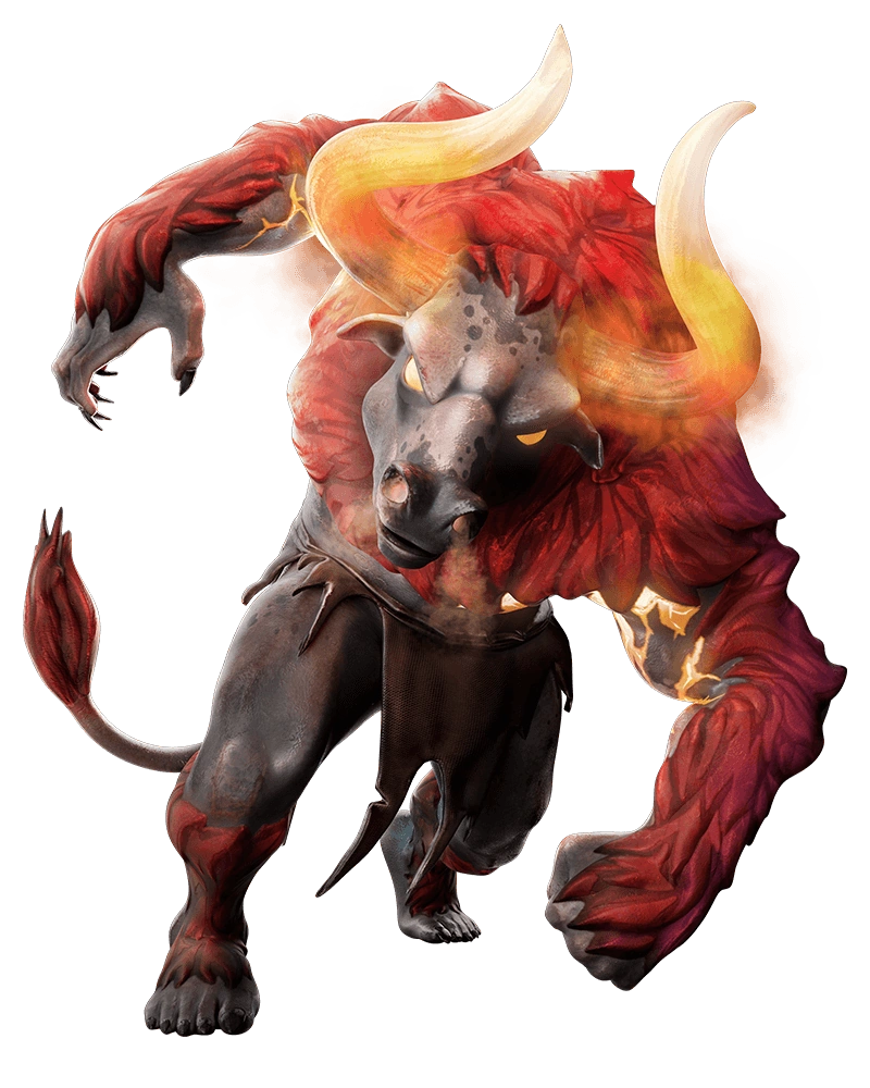 As it rears up on its hooves, muscular arms slamming the ground, horns leveled at you, the beast prepares to charge!]